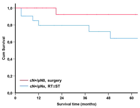 Kaplan–Meier plots of 21 patients with originally planned surgical tumor resection, therapeutic neck dissection and PORT (red line), in whom treatment was finally de-escalated to surgery alone (cases), and matching patients with cN+ (blue line) who were admitted to definitive primary RT ± ST (controls; n = 21; log rank p = 0.18).