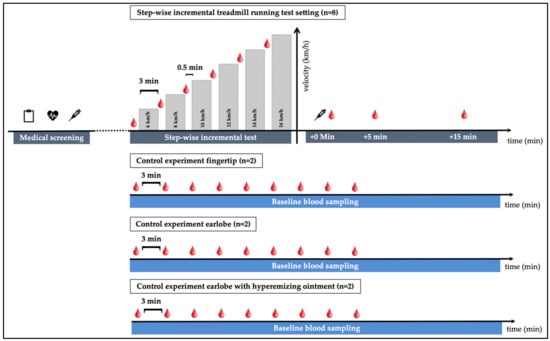 Study outline: 5 participants, three of whom performed a retest, performed a total of 8 incremental exercise tests. Tests started at 6 km/h with increases of 2 km/h and a duration of 3 min per step. Pause time between steps was roughly 0.5 min. A total of 3 additional control experiments were performed: 9 repeated blood samplings at rest with 3 min in between from (i) alternating fingertips (n = 2), (ii) from the earlobe without hyperemizing ointment, (iii) from the earlobe with an hyperemizing ointment (n = 2).