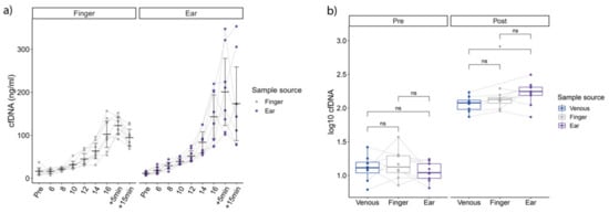 (a) shows cfDNA concentrations on all steps from the fingertip (left) and the earlobe. (b) outlines pre to post concentrations. Significant differences determined via T-test (p < 0.05) in ear compared to venous concentrations, without post-hoc correction.