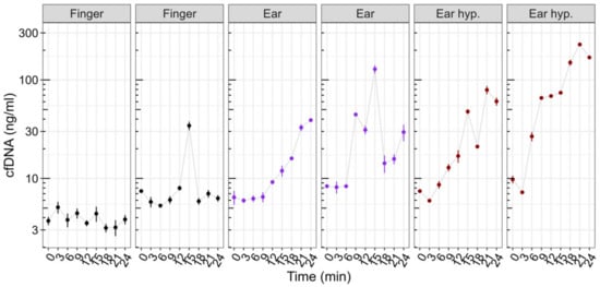 Control experiment at rest using fingertip (black) and earlobe without (purple) and with hyperemizing ointment (brown). Fingertip concentrations with one outlier (case 2, min 15). Earlobe sampling with several outliers and a tendency to increase over time with and without the use of hyperemizing ointment at the sampling site. The points and error bars represent the mean and SD for the technical triplicate determination of cfDNA concentration.