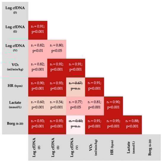 Spearman Correlations (rs) between variables obtained during incremental running tests (all participants included). All p-values were Bonferroni corrected for 21 comparisons. Non-significant correlations were crossed out. The non-significant correlation between venous cfDNA and Borg-scale is based on a small sample size (n = 7) because only post-exercise Borg scores, usually reported as 19 or 20, could be compared with venous cfDNA. VO2 = oxygen consumption; HR = heart rate; bpm = beats per minute; E = earlobe; F = fingertip; V = venous.