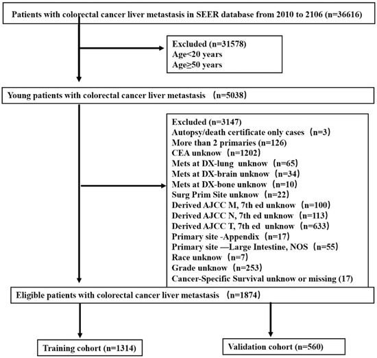 We identified 1874 young-onset CRLM patients in the SEER database using the following selection criteria: aged 20–49 years, and CLRM evident at the initial diagnosis from 2010 to 2016. Patients diagnosed on the basis of autopsies or death certificates were excluded, as were those without comprehensive information. Figure 1 shows a flow diagram of the patient selection process. SEER database analyses are exempt from medical ethics approval, so no informed patient consent process was necessary.