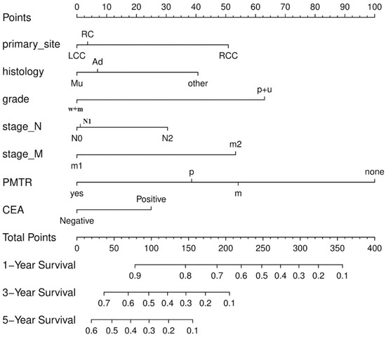 Seven characteristics, including the primary tumor site, degree of differentiation, N stage, M stage, histology, surgery, and CEA level were independent predictors of CSS on multivariate Cox’s regression analysis (Table 2).