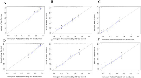 Calibration plots of the nomogram for 1-, 3-, and 5-year CSS prediction in the training set (A–C) and validation set (D–F).