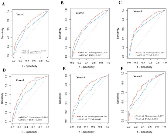 Comparison of the ROC curves of the nomogram and the TNM stage for 1-, 3-, and 5-year CSS prediction in the training set (A–C) and validation set (D–F).