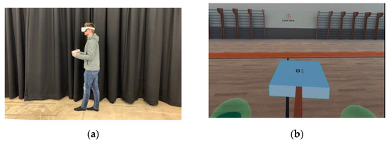 (a) A participant wearing the Oculus Quest headset and holding the two hand controllers. Any movements of the head and hands are captured by the motion controllers at 50 Hz. (b) An image showing what the participant saw inside the Oculus Quest headset when they were subjected to the ‘tilt’ visual field manipulation. Note the virtual green spheres at the bottom of the image which acted as a standardized visual reference for the hand position.