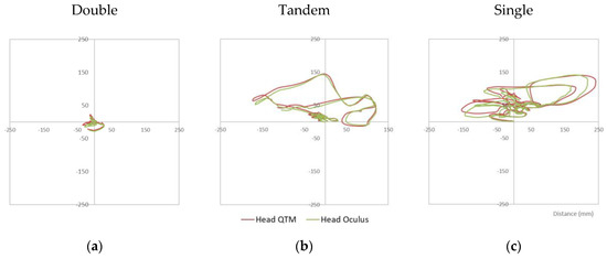 The data showed that the type of stance influenced the ICC values (comparisons between COP measures and head sway measures), with the Double stance showing a moderate relationship (0.55 (Oculus); 0.45 (Qualisys)), Single stance showing a good relationship (0.65 (Oculus) and 0.64 (Qualisys) and Tandem stance showing an excellent relationship (0.89 (Oculus) and 0.88 (Qualisys) when it comes to comparing head movement distance and COP excursion. The lower correspondence between the Double stance can be explained by the fact subtle micromovements can be made between the feet and the ground to change the distribution of weight across this wider base of support. In this case, movements of the head to adjust postural imbalance is likely to be minimal. The opposite is true for the Single stance condition where there is only one foot in contact with the ground and the registration of postural adjustments through the COP are less obvious as the other limbs and the head will be used to control balance. Tandem stance, however, is still a double support stance meaning more force will be exerted through the ground giving more credence to the COP measure. Importantly, however, in a Tandem stance (see Figure 1), the base of support is narrowed in the medial-lateral axis meaning any movements to adjust posture will be in the medial–lateral axis and will be accentuated through movements of the head. This makes head sway an ideal candidate for measuring changes in postural control in Tandem stance. Furthermore, the Oculus head measurements were ever so marginally stronger than Qualisys, again offering support for low-cost VR head tracking as an alternative to more expensive balance measurement systems.