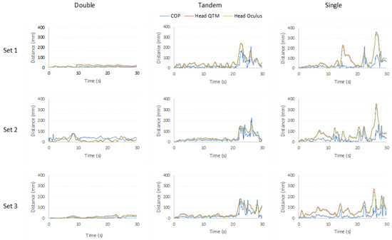 Graphs showing the distance covered by each of the three signals calculated in all three data sets for the COP (blue), Head Sway Qualisys (red) and Head Sway Oculus (green) measures. Notice how the correspondence is closest for all 3 signals in the Tandem stance data. This is also reflected in the ICC values presented in Table 2.
