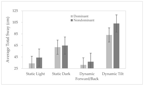 In terms of effects of stance on postural control, Figure 4 shows the mean average total sway when the visual manipulations occurred in the dominant stance compared to the non-dominant stance.