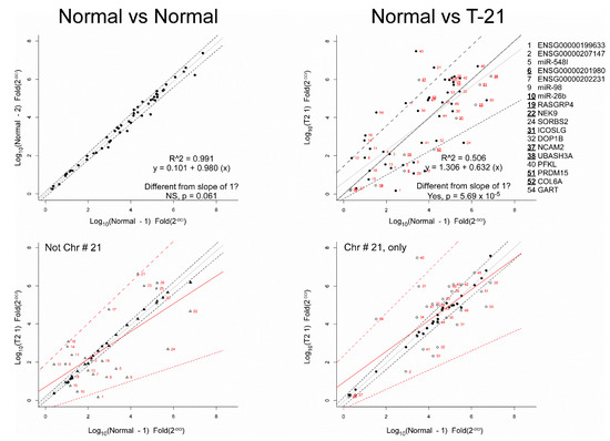 As shown in Figure 1, right, the log-fold value for RNA markers in the normal control group was plotted against the log-fold value for the RNAs in the T21 group, and a simple linear regression line was fitted (gray line). The R22 of the predicted line was < 0.51, and the slope of the regression line (0.632) was significantly different from a slope of 1 (the black line, p < 0.001). This result supports the differential expression of RNAs between T21 and normal control. It was noted that differentially expressed RNAs were found both on chromosome #21 (Figure 1, bottom right), and not on chromosome #21 (Figure 1, bottom left).