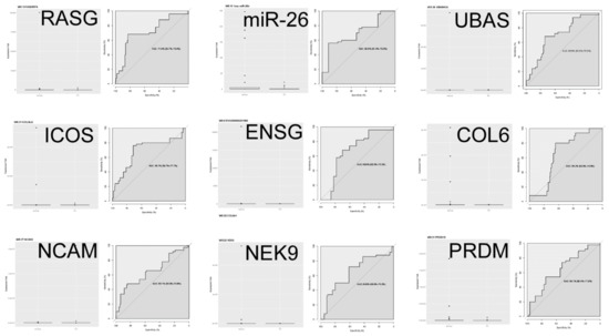 Boxplots and receiver operator characteristic (ROC) curves for the nine differentially expressed RNAs following Bonferroni correction for false discovery rate.