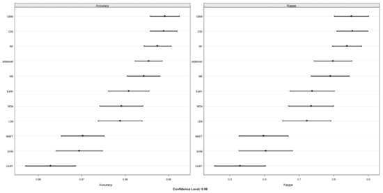 Using the CARET package in R, eleven machine learning (ML) algorithms were surveyed to predict trisomy 21 (T21). Left panel displays performance based upon accuracy, and the right panel displays the Kappa value. The bars represent the 95% confidence interval. Algorithms were all trained on the randomly allocated 75% partition using 10-fold cross-validation, e.g., the training dataset is randomly allocated into 10 parts and trained on 9 and tested on the one holdout, and this was repeated 5 times. Abbreviations: GBM: gradient boosting machine; C50, classification of data and decision tree algorithm C5.0; RF: random forest; adaboost, a decision tree model that uses a boosting method to improve learning rate; NB: naïve Bayes, a classification method that is based on Bayes’ theorem; Earth: multivariate adaptive regression splines model; MDA: flexible discriminant analysis, LDA: linear discriminant analysis; NNET: neural network; SVM: support vector machine; CART: classification and regression trees.