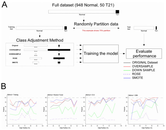 Because class imbalance can affect the efficiency of ML modeling [72,73,74], we investigated this possibility by using four methods: Oversampling, downsampling, ROSE, and SMOTE. These methods employ different tactics to balance class in the training dataset (see [75] for a detailed discussion). Differences in the efficiency of the four methods for model training were revealed by their predictive performance on the independent test data. Oversampling and SMOTE generally improved performance over the original dataset, while downsampling and ROSE generally decreased performance. Models trained using partition sizes >66% and <85% performed better at predicting T21. While our results are encouraging and show improvement over previous modeling efforts, the testing of a new, independent, and more diverse patient population is necessary to validate/refine the predictive models and determine whether they hold up across race and ethnic groups and across gestational epochs. Furthermore, it may be possible to improve the predictive power with little to no added cost by the inclusion of both maternal and paternal age and other biographical variables. Fortunately, the implementation of “simple” qRT-PCR technology coupled with the minimally invasive sampling early in pregnancy lowers the barriers to follow-on this work.