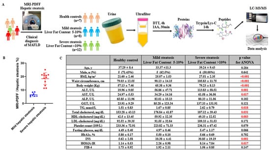 Five participants were excluded because of missing data. Three participants were excluded because of a reported history of liver disease. Finally, a total sample of 57 subjects were included for analysis, 27 for the discovery proteomics analysis set and 30 for the validation set, respectively. Figure 1A summarizes the sample compilation and statistical analyses. In total, 27 urine specimens passed the quality check (QC), with 7 healthy controls and 20 MAFLD patients without any kind of kidney disease. All patients were subjected to liver fat content measurement with MRI-PDFF; 8 patients were defined as having mild hepatic steatosis, and 12 patients were defined as having severe hepatic steatosis. (Figure 1A,B) Laboratory procedures were all followed to detect sample heterogeneity by the same sample preparation processes, as well as the mass spectrometry analysis. Of the included participants, the BMI, waist circumference, body weight, ALT, TG, total cholesterol, and HDL-cholesterol were significantly different among the healthy control, mild hepatic steatosis, and severe hepatic steatosis groups, while age, male gender, ALP, GGT, glucose, and FIB-4 were not different (Figure 1C).