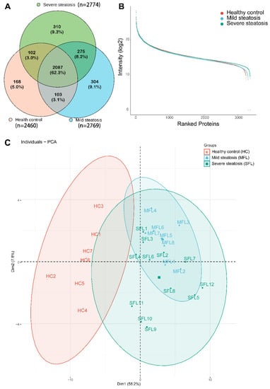 The number of identified proteins in the control group, mild steatosis group, and severe steatosis group grew quickly and gradually became saturated when the sample size increased (Figure 2A). The protein numbers for the healthy control, mild steatosis, and severe steatosis groups were 2152 ± 187.2, 2552 ± 149.5, and 2404 ± 135.7, respectively. Detailed information about the identified proteins for each sample is presented in Supplementary Figure S1.
