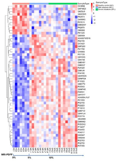 The clustering heatmap analyses differentiate mild hepatic steatosis and severe steatosis of MAFLD patients from healthy controls in proteomic features. Patients were ordered in increasing severity of hepatic steatosis measured by MRI-PDFF (from left to right). Hierarchical clustering was performed only on the 53 proteins significant by ANOVA.