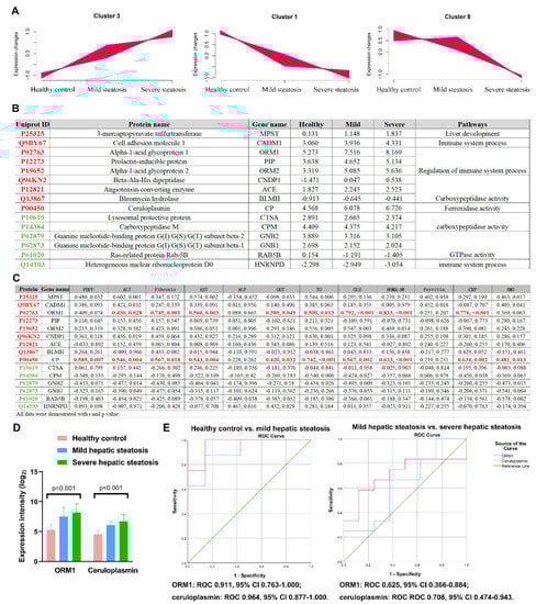 Two proteins were finally filtered for distinguishing mild/severe steatosis. (A) Among 12 clusters, cluster 3 included consistently up-regulated proteins from healthy controls to mild hepatic steatosis and to severe hepatic steatosis patients, whereas clusters 1 and 8 included consistently down-regulated proteins. (B) The GO analysis and expression (log2) of the filtered proteins (red color for up-regulated and green for down-regulated). (C) The Pearson association of 9 unique filtered proteins with clinical parameters. (D) The expression intensity (Un-log2) of selected ORM1 and ceruloplasmin, which were most strongly correlated with liver fat content (measured by MRI-PDFF), fibrosis, ALT, triglyceride, glucose, HOMA-IR, and C-reactive protein. (E) The diagnostic accuracy of ORM1 and ceruloplasmin for hepatic steatosis from healthy controls (right panel) and severe hepatic steatosis from mild hepatic steatosis patients (right panel) was calculated based on the expression intensity of proteomic data.