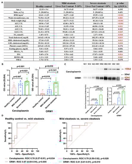 Western blot and ELISA (results were normalized to the urine creatinine excretion) were performed to validate the expression of ORM1 and ceruloplasmin in the urine samples of MAFLD patients. In the validation set, 30 cases without any kidney disease or other liver diseases were also included, with 10 healthy controls, 10 mild hepatic steatosis patients, and 10 severe hepatic steatosis patients. Figure 5A shows the baseline characteristics of patients in the validation set, in which the distribution was equal between age (p = 0.395), male gender (p = 0.451), fasting glucose (p = 0.056), etc. In the ELISA test, both ceruloplasmin (healthy control 3.02 ± 1.43 vs. mild steatosis 4.27 ± 1.18 vs. severe steatosis 5.61 ± 1.31, p < 0.001) and ORM1 (healthy control 1.19 ± 1.085 vs. mild steatosis 3.41 ± 2.61 vs. severe steatosis 4.68 ± 3.154, p = 0.011) showed an increased tendency from healthy controls to mild steatosis and severe steatosis (Figure 5B), and these results were further validated by the western blot (Figure 5C). Moreover, based on the ELISA, ceruloplasmin (ROC 0.78, 95% CI 0.57–0.91, p = 0.034, sensitivity 81.5%, specificity 79.5%) and ORM1 (ROC 0.87, 95% CI 0.69–0.94, p = 0.005, sensitivity 96.5%, specificity 82.5%) showed moderate diagnostic accuracy in distinguishing mild steatosis from the healthy controls. Ceruloplasmin (ROC 0.79, 95% CI 0.58–0.92, p = 0.028, sensitivity 91.5%, specificity 80.5%) and ORM1 (ROC 0.81, 95% CI 0.61–0.91, p = 0.019, sensitivity 82.5%, specificity 81.5%) also showed moderate diagnostic accuracy in distinguishing severe steatosis from mild steatosis (Figure 5D).