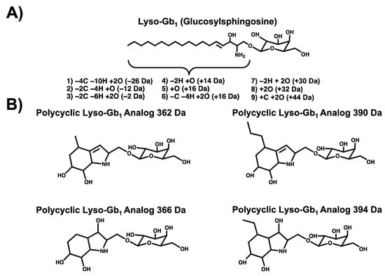 Figure 1. Potential GD biomarkers highlighted in urine specimens: (A) lyso-Gb1 chemical structure with structural modifications observed on the sphingosine moiety in lyso-Gb1 analogs; (B) Polycyclic lyso-Gb1 analog chemical structures [22].