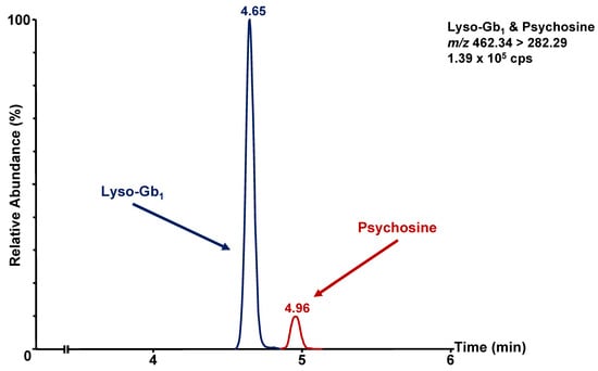The chromatographic method was developed with the following two main objectives: (1) the separation of lyso-Gb1 from its structural isomer galactosylsphingosine (psychosine), and (2) a reduction in the matrix effect in the analyte and internal standard elution regions. When considering the separation of lyso-Gb1 from psychosine, some may argue that the psychosine concentration is negligible compared to the concentration of lyso-Gb1 in GD patients. We believe that a chromatographic separation of these two structural isomers allows greater applicability of the method described herein. Indeed, the chromatographic separation of lyso-Gb1 and psychosine favors the adaptability of the method for biomarker quantitation, particularly for Krabbe disease. Moreover, the efficient separation of both metabolites eliminates the risk of potential contamination from one metabolite to the other, which could affect the accuracy of the results. As shown in Figure 2, the separation of lyso-Gb1 and psychosine was achieved using the proposed chromatographic parameters.
