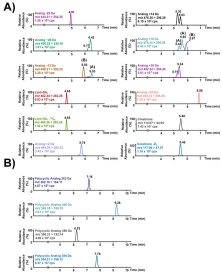 Figure 3. Chromatographic separation of potential lyso-Gb1 biomarkers and creatinine with their respective internal standards. (A) Ion chromatograms using a MRM mode for lyso-Gb1, lyso-Gb1-(13C6), lyso-Gb1 analogs, as well as creatinine in a GD patient urine sample. (B) Ion chromatograms obtained by MRM mode of polycyclic lyso-Gb1 analogs in a GD patient sample. CPS: counts per second.