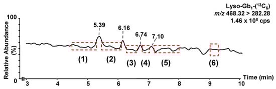 Regarding the matrix effect, there are no commercially available standards or internal standards for lyso-Gb1 analogs or polycyclic analogs. Therefore, lyso-Gb1-(13C6) was used as an internal standard for all these molecules. To correct the matrix effect, all these metabolites need to be compared under the same conditions, targeting a similar matrix effect. A relatively stable matrix effect was achieved for the entire duration of the chromatographic separation for all analytes using an isocratic gradient. As shown in Figure 4, there were no regions with a significant ion enhancement or suppression between 3 and 10 min corresponding to the retention time of lyso-Gb1 and the related metabolites. More specifically, a continuous infusion of lyso-Gb1-(13C6) revealed three regions with high ion enhancement effects at 5.39 min, 6.16 min, and 6.74 min. Most analytes do not elute within those three regions; hence, they are not affected by the ion enhancement effect observed. However, lyso-Gb1 analogs +14, +16, and +30 Da do have retention times relatively close to 5.39. However, even for those analytes, considering there is some difference in the retention time, we are confident that biases in quantitation caused by the matrix effect will be less than 15% for all analytes.