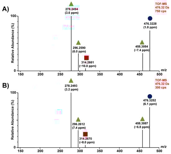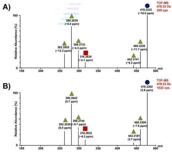 Figure 6. Fragmentation of lyso-Gb1 analogs +16 Da. In (A), fragments from the metabolite with a retention time of 5.43 min; In (B), fragments obtained from the metabolite with a retention time of 5.65 min; in both (A,B), the molecular ion is indicated by a purple circle, a green triangle shows a loss of a water molecule, and a red square indicates a loss of a sugar unit. CPS: counts per second. Parts per million (ppm) refers to the difference between experimentally measured masses (accurate mass) and theoretical masses (exact mass).