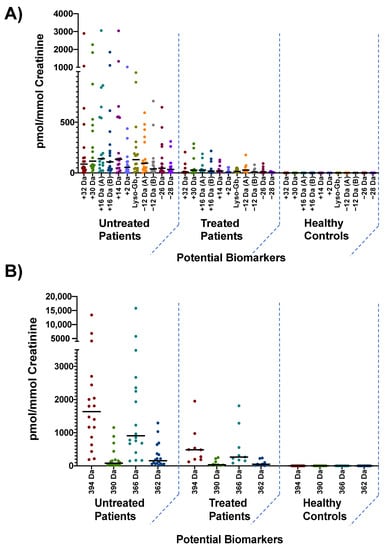 Figure 7. Distribution of: (A) lyso-Gb1 and analogs +32, +30, +16 (A) and (B), +14, +2, −12 (A) and (B), −26, as well −28 Da; and (B) Distribution of polycyclic analogs 394, 390, 366, and 362 Da in untreated (n = 18), treated (n = 9) and healthy controls (n = 9). The median concentration for each potential biomarker in indicated by a horizontal black bar.