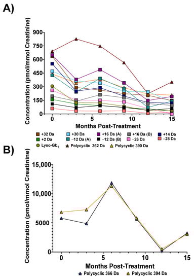 Figure 8. Biomarker concentration levels post-ERT treatment in a 55-year-old female GD type 1 patient with p.N370S/D409H mutations: (A) Concentration variation levels post-ERT for lyso-Gb1, lyso-Gb1 analogs +32, +30, +16 (A), +16 (B), +14, +2, −12 (A) and (B), −26, and −28 Da, as well as polycyclic analogs 390 and 362 Da; (B) Concentration variation levels post-ERT for polycyclic lyso-Gb1 394 and 366 Da.