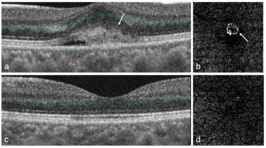 OCTA is also very helpful for detecting mCNV noninvasively with high sensitivity and specificity (Table 2). SD-OCTA has shown to be useful for the early detection as well as treatment monitoring of mCNV (Figure 2) [93]. The fundamental benefit of OCTA is that it is non-invasive, allowing for multiple scans to be examined during each follow-up visit. However, generally OCTA cannot achieve accurate evaluation of the disease activity. Therefore, it is recommended to use multi-model imaging such as OCTA together with OCT to fully assess mCNV [8], which may show higher sensitivity than each modality alone [94]. Recently, however, a unique diagnostic technique using OCTA combining mCNV appearance, anastomoses/loops, and vascular branching has been proposed, which may be a useful tool for assessing the disease activity of mCNV [95]. Interestingly, researchers found an excellent agreement in mCNV area measurements and a poor agreement in mCNV vessel density measurements for SS-OCTA devices in automatic and manual segmentations [96]. In addition, OCTA is also useful to evaluate the anti-vascular endothelial growth factor (VEGF) therapy for mCNV [97,98,99], in which the vessel junctions may be one of the most important biomarkers [100]. OCTA-based analysis generated both intuitive images and quantitative data, which could lead to new perceptions of treatment response evaluation for mCNV [100]. However, OCTA bears several limitations. Due to a longer acquisition time, blinking or loss of fixation can lead to motion artifacts presented as dark bands in the image [101]. Projection artifacts can also occur, such as the projection of the superficial retinal vascular networks onto the choriocapillaris layer [101]. In addition, the performance of image segmentation can drop when the retinal structure is interrupted by mCNV.