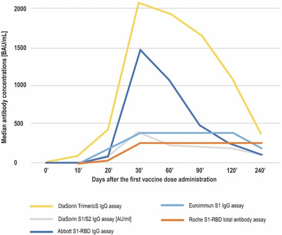 The course of anti-spike SARS-CoV-2 antibodies production over 8 months after the first vaccine dose administration. Apart from DiaSorin’s S1/S2 assay, which is expressed in AU/mL, the median concentrations are given in BAU/mL.