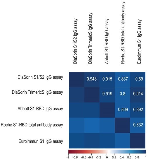 - Perkmann, T.; Perkmann-Nagele, N.; Koller, T.; Mucher, P.; Radakovics, A.; Marculescu, R.; Wolzt, M.; Wagner, O.F.; Binder, C.J.; Haslacher, H. Anti-Spike Protein Assays to Determine SARS-CoV-2 Antibody Levels: A Head-to-Head Comparison of Five Quantitative Assays. Microbiol. Spectr. 2021, 9, e0024721. [Google Scholar] [CrossRef]