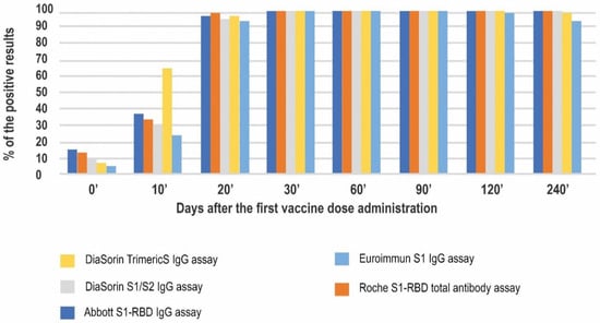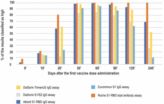 The aim of our study is to depict the performance of some of the anti-S SARS-CoV-2 immunoassays most commonly used in European medical laboratories in the context of the response to COVID-19 vaccination. The antibody composition in COVID-19 vaccinees may be different from that observed in convalescents []. To our knowledge, this is one of the very few papers encompassing head-to-head comparison of five methods over such a long course (eight months) after primary immunization. This study’s added value includes the multiple timepoints at which the humoral response to the vaccination was assessed.