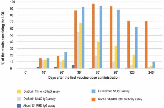 In contrast, the highest number of results exceeding the UQL was found for the Roche test. The median values of antibody concentrations were higher than the assay’s UQL starting at day 30′ and until the end of this study. Therefore, the ability of this test, used without dilutions, to show the dynamics of antibody changes after vaccination, is compromised. A similar problem was observed for the Euroimmun’s S1 IgG assay, which showed a very high percentage of results above the UQL between days 30′ and 120′. However, between days 120′ and 240′ this percentage dropped from 71.0 to 10.6, and the results for 5% of the samples were already below the cut-off for a positive result.