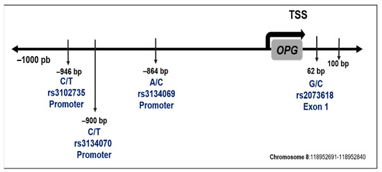 To identify potential response elements for transcription factors as a consequence of polymorphisms in the OPG gene promoter, the in silico analysis was performed with the bioinformatics software tools PROMO version 3.0.2, website (http://alggen.lsi.upc.es/cgi-bin/promo_v3/promo/promoinit.cgi?dirDB=TF_8.3 (accessed on 12 March 2022)). This analysis was performed on flanking sequences of 25 bases upstream and 25 bases downstream for the two alleles of each polymorphism, with a dissimilarity margin less than or equal to 15% [26]. Also, SNPinfo website (https://snpinfo.niehs.nih.gov/snpinfo/snpfunc.html (accessed on 12 March 2022)) was employed and the analysis of SNPrsID corresponding to each polymorphism included the allele frequency data from all populations reported in HapMap and dbSNP [27].