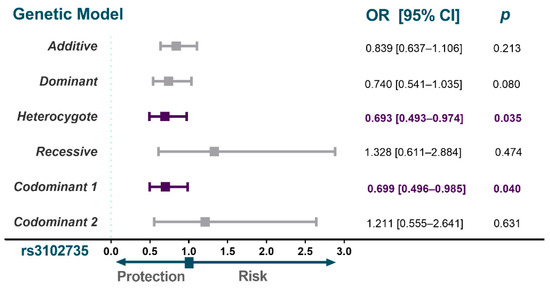 Two haplotypes (GACT and GACC) had different frequencies between groups (Figure 3); individuals with SA showed an increased frequency of the GACT haplotype when compared to the control group (OR = 1.208, 95% CI = 1.020–1.431, p = 0.029). While the GACC haplotype showed a decreased frequency in individuals with SA when compared to the control group (OR = 0.641, 95% CI = 0.414–0.990, p = 0.045).