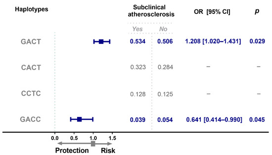 OPG haplotype frequencies in individuals with subclinical atherosclerosis. Haplotype analysis was performed based on the order and position of the polymorphisms in the chromosome. (rs2073618, rs3134069, rs3134070, rs3102735). OR, odds ratio; CI, confidence interval.