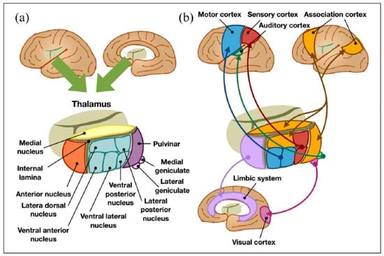 (a) Anatomical and (b) functional classification of the thalamus [reproduced from [] the under the open access. Copyright © 2022 by SAGE Publications].
