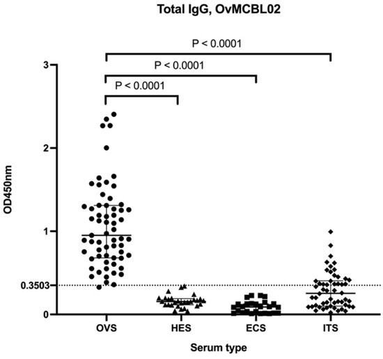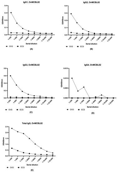 3.6. Total IgG, IgG1, IgG2 and IgG3 but Not IgG4 Subclass Responded Positively to OvMCBL02 Multiepitope Antigen