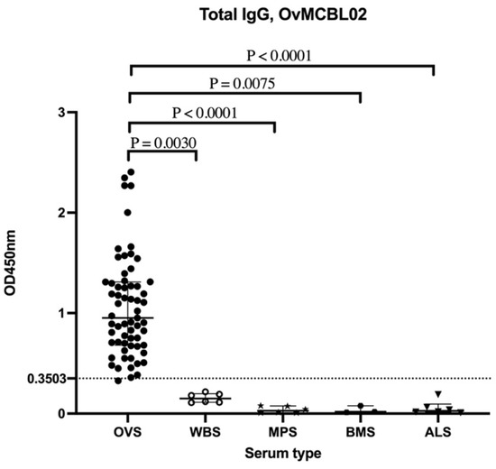 3.4. Humoral Immune Response to OvMCBL02 Multiepitope Antigen