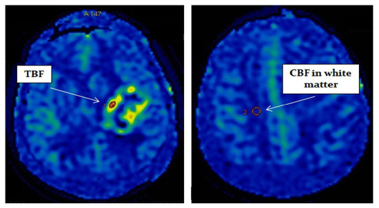 Postprocessing of the obtained data was performed using the ReadyView software package (GE Healthcare). To measure blood flow in the tumor, a region of interest (ROI) with an area of 20 mm2 ± 10 mm2 was designated in the zone with the highest CBF value (determined on color blood flow maps). In the designated ROI, the average value of TBF was calculated. To eliminate individual blood flow differences, we normalized TBF (nTBF) to blood flow in the intact white matter of the contralateral hemisphere semioval center. For this purpose, ROI with the same area (20 mm2 ± 10 mm2) as the tumor ROI was placed—Figure 1. To obtain normalized values, the obtained TBF data were divided by the blood flow in the semioval center (nTBF = maxTBF/CBF of the intact white matter of the contralateral hemisphere semioval center).