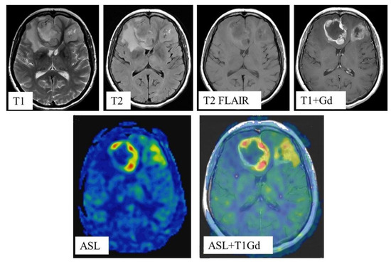 - Warmuth, C.; Gunther, M.; Zimmer, C. Quantification of blood flow in brain tumors: Comparison of arterial spin labeling and dynamic susceptibility-weighted contrast-enhanced MR imaging. Radiology 2003, 228, 523–532. [Google Scholar] [CrossRef]