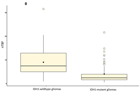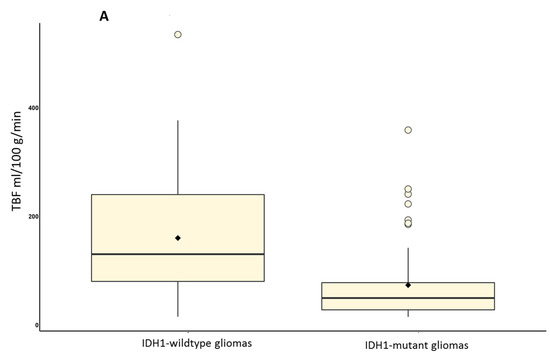 The maximum TBF in wildtype gliomas (n = 48) was 160.05 ± 109.58 mL/100 g/min, nTBF was 9.03 ± 6.17. The maximum TBF in the IDH1-mutant glioma group (n = 58) was 73.35 ± 70.76 mL/100 g/min, nTBF was 4.06 ± 4.14—(Figure 3).