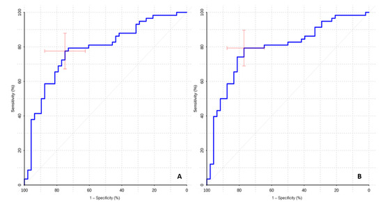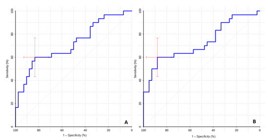 Statistical processing was carried out in the R-project program (https://www.r-project.org (accessed on 5 April 2022); for ROC analysis, the pROC library was used. In this work, nonparametric methods were chosen for statistical analysis. Mann-Whitney test was performed for pairwise group comparison. Correlation coefficients were calculated using Spearman’s test.
