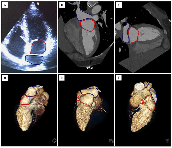 The cor triatriatum sinister. The proper atrium is marked with a red outline, while the accessory atrium is marked with a blue outline: (A) echocardiography, long axis, four-chamber projection; (B) cardiac computer tomography angiography (CCTA), multiplanar reconstruction (MPR), long axis, four-chamber projection; (C) CCTA, MPR reconstruction, long axis, two-chamber projection; (D) CCTA, volume rendering technique (VRT) reconstruction, right side view; (E) CCTA, VRT reconstruction, posterior view; (F) CCTA, VRT reconstruction, left side view.