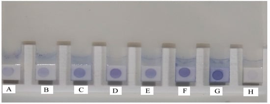 Standardization of the IgM-based DEDT was conducted by dotting the NCM provided at the tip of each plastic combs with 1 µg of purified rLigA/BCon1-5 antigen, and the optimum dilutions for field sera and anti-human IgM HRP conjugate were found to be 1:50 and 1:2500, respectively. The field sera, which gave blue colour dots on the NCM, were considered as positive while non-reactors failed to give a blue colour dot on the NCM (Figure 2). A positive correlation exists between the MAT titre and the intensity of colour of the blue dots. Human sera (n = 51), which showed a positive reaction in the single acute MAT (MAT titre ≥ 400), and human sera (n = 4), which showed a four-fold rise in the MAT titre (≥50 to ≥200), gave high intensity blue dots (Figure 2c–f), while human sera (n = 8), which showed seroconversion (0 to ≥100), gave low intensity blue dots (Figure 2a,b) on the NCM provided at the tips of plastic combs. Three human sera, which showed seroconversion (0 to ≥100), gave no blue colour dots (Supplementary Table S1B), while one MAT−ve sera gave a high intensity blue dot in the IgM DEDT (Supplementary Table S1A,B).
