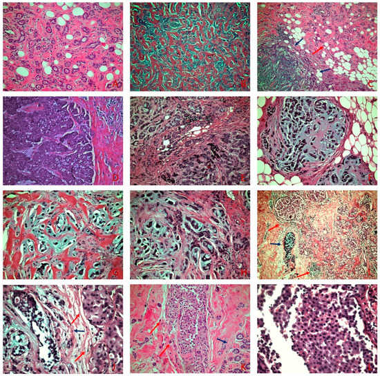 (A) MGA with small round uniform tubules lined with a single layer of cuboidal epithelial cells with occasional eosinophilic luminal secretion (H&E × 100). (B) AMGA displays areas of greater architectural complexity compared to MGA (H&E × 100). (C) MMPC (blue arrows) adjacent to MGA (red arrow) (H&E × 100) (D) Areas of solid invasive carcinoma adjacent to areas consisting of small nests with an abrupt transition to chondromyxoid matrix (H&E × 100). (E–H) Small nests, cords, single cells, tubular-like structures, and ring-like structures, embedded in a chondromyxoid matrix (H&E × 200). (I) On low power examination, PLCIS (red arrows) is adjacent to MMPC (blue arrow) (H&E × 40). (J) PLCIS (red arrows) shows cells with moderate to severe atypia, eosinophilic granular cytoplasm, and central to eccentric hyperchromatic nuclei adjacent to MMPC (blue arrow) (H&E × 200) (K) PLCIS (red arrows) adjacent to MGA (blue arrow) (H&E × 100). (L) On high power examination, lack of cellular cohesion is evident in the PLCIS (H&E × 400).