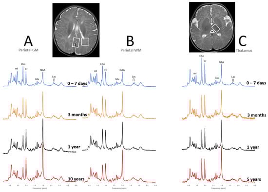 Metabolic maturation of the human brain. Shown are representative “closest-to-normal” spectra for parietal gray matter (GM, A), parietal white matter (WM, B), and thalamus (C) acquired from pediatric term-born patients at different points of brain development. MR images as well as clinical follow up were unremarkable for all subjects. Note, that metabolic profiles vary both with age and tissue type. All spectra were acquired on 3T scanners with SV-PRESS, echo time (TE) = 35 ms, and repetition time (TR) = 2000 ms.
