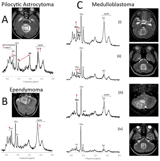 MR spectra of common pediatric posterior fossa tumors. Metabolic profiles of posterior fossa pilocytic astrocytoma (A) are generally relatively predictable. Pilocytic astrocytomas show elevated lactate and lipids. There is signal consistent with N-acetylated sugars (N-acetyl (NA) at ≈2 ppm and a broad signal from sugars at ≈3.8 ppm), while creatine (Cr) and myo-inositol (mI) levels are low. Ependymomas (B) have less predictable profiles. Whereas lipids are often prominent, they are not elevated in every ependymoma. Similarly, levels of other metabolites, such as mI can vary considerably. Medulloblastomas (C) are embryonal tumors that can present with strikingly different metabolic profiles for individual patients. To what extent metabolic profiles correlate with the molecular subgroups is an area of active research [41]. Above, examples for group 3 (i), group 4 (ii), sonic hedgehog (iii), and WNT (iv) are shown. Taurine (Tau) and glycine (Glyc) are often (but not always) detectable in these tumors. Medulloblastomas are generally more cellular tumors with higher absolute metabolite levels. For example, average choline (Cho) levels are approximately medulloblastoma:ependymoma:pilocytic astrocytoma = 5:3:2 [37], which cannot be appreciated when spectra, that are scaled to their tallest peaks, are compared. All spectra were acquired on 3T scanners with SV-PRESS, TE = 35 ms, and TR = 2 s.