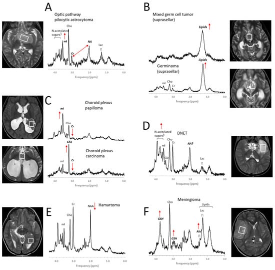 Examples for MR spectra of pediatric brain tumors outside the posterior fossa. Metabolic profiles of pilocytic astrocytomas elsewhere in the brain (A) are comparable with those in posterior fossa PAs, except that, often, higher myo-inositol (mI) is observed [42]. The MR spectra of germ cell tumors, including pure germinomas, (B) frequently show prominent lipids, and their quality is often limited (broad signals) possibly due to calcification and heterogeneity at microscopic levels. Among choroid plexus tumors (C), papillomas present regularly with prominent myo-inositol (mI), whereas choline (Cho) is prominent in carcinomas. Dysembryoplastic neuroepithelial tumors (DNETs, (D)) are low-grade glioneuronal tumors. Note that the signal at ≈2 ppm (with a corresponding broad signal at ≈3.8 ppm), is more similar (position on ppm axis and line width) to the N-acetyl (NA) signal observed in pilocytic astrocytoma than to N-acetylaspartate (NAA) in normal brain. A noncancerous hamartoma (E) shows a spectrum that is consistent with a mixture of tumor cells with normal tissue with only slightly reduced NAA and unremarkable lipids and lactate (Lac) as well as unremarkable other metabolic features. The presence of alanine (Ala) and high glutathione (GSH) [43,44] identifies meningiomas (F), a dural-based tumor. In addition, creatine (Cr) is depleted in meningiomas, and lactate and lipids are readily detectable. All spectra were acquired on 3T scanners with SV-PRESS, TE = 35 ms, and TR = 2 s.